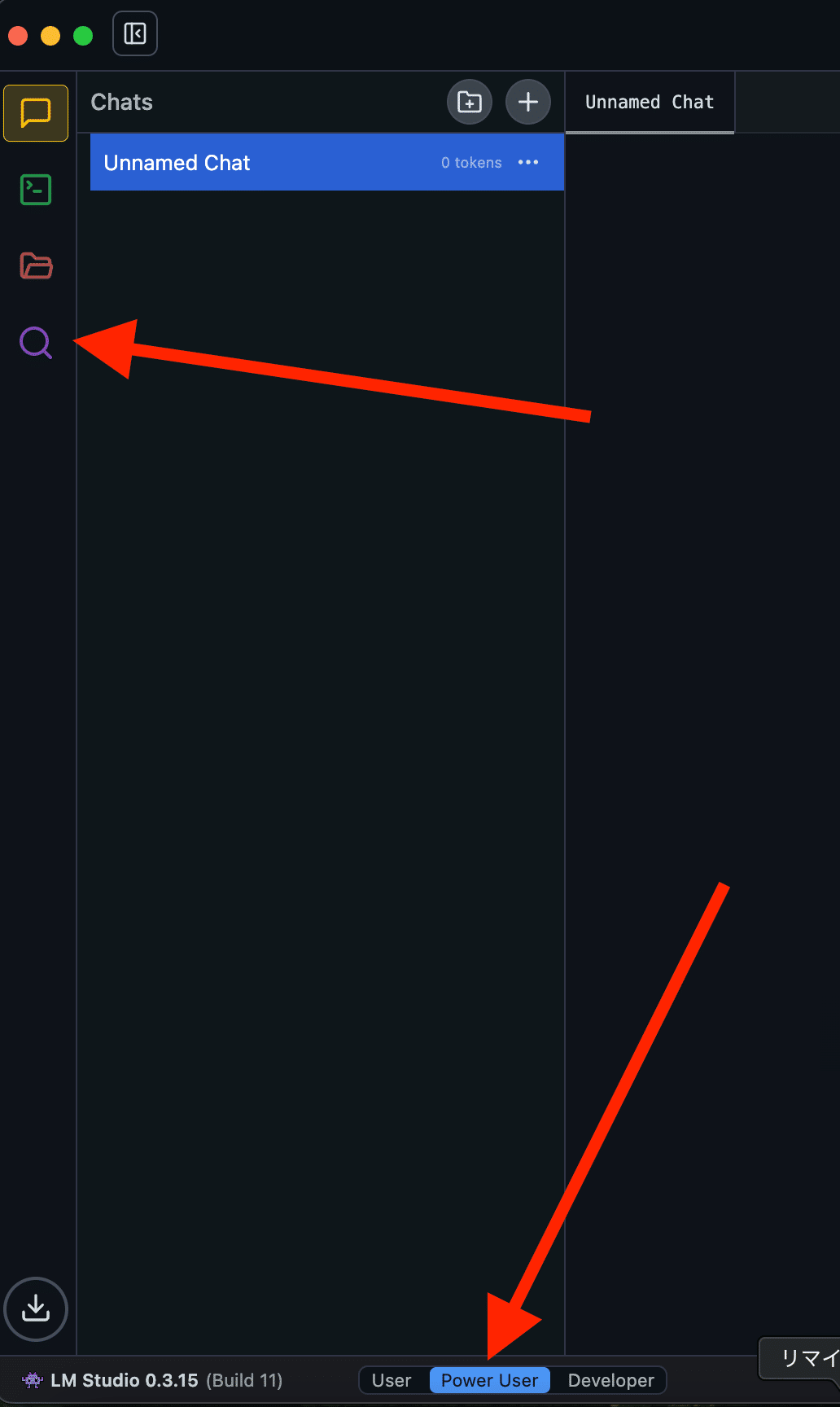 LM Studioにはモデルを検索して追加できる探索機能があります。画面下部でモードを「Power User」に切り替えると左サイドバーに検索アイコンが現れるので、クリックします。