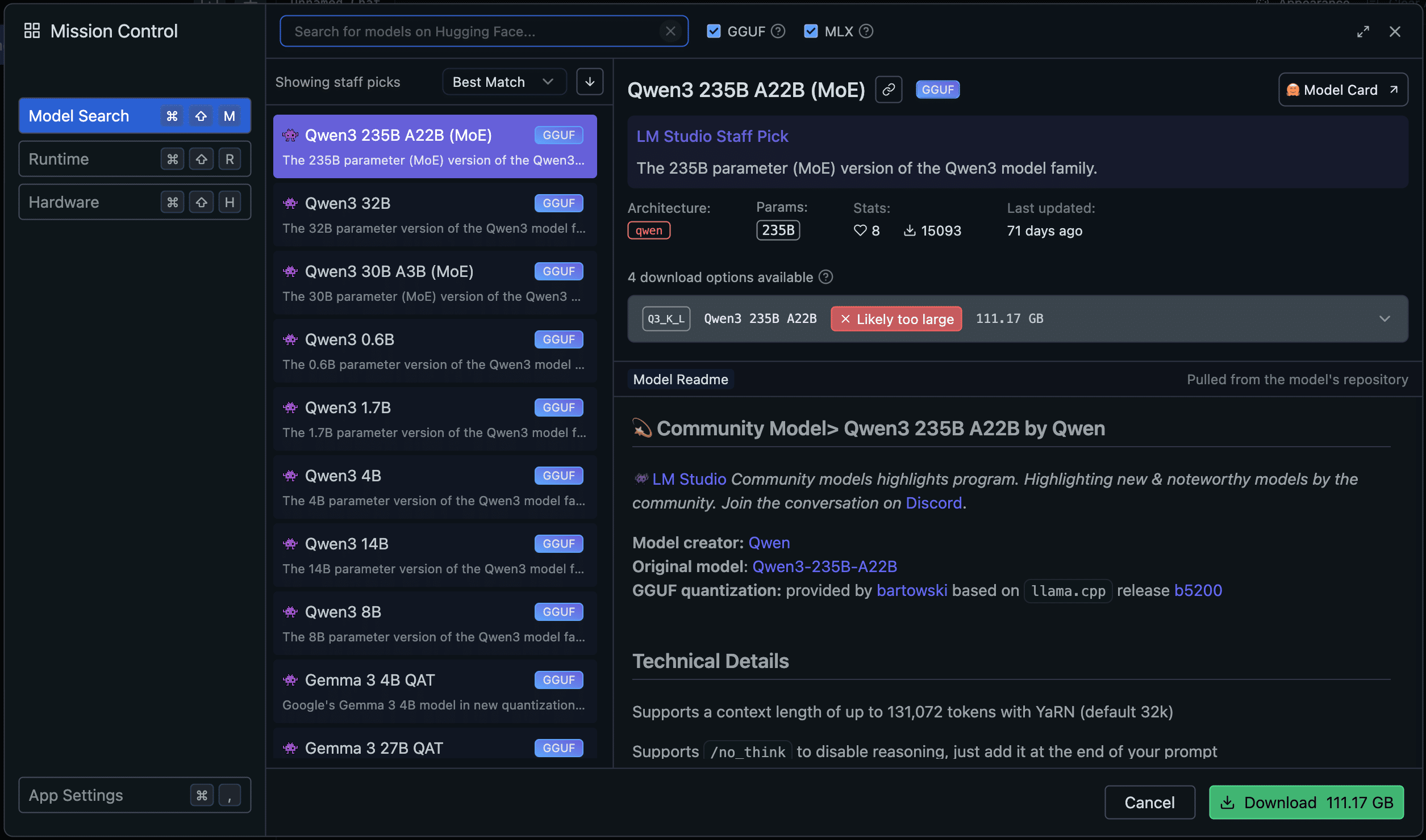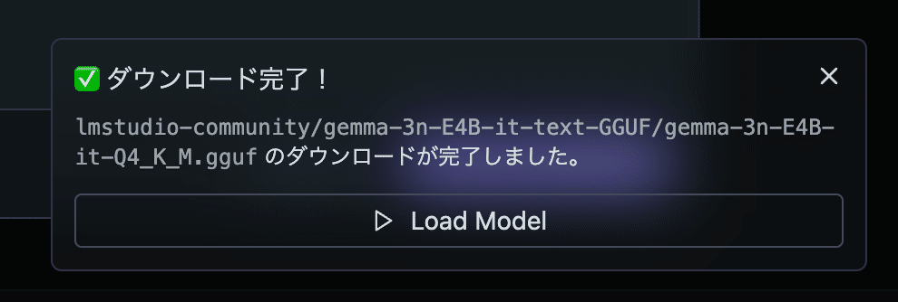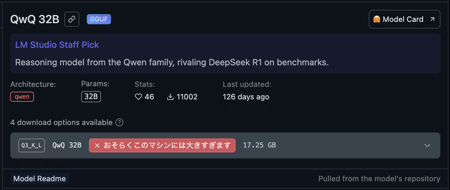 ※極端に大規模なモデルを選ぼうとすると「おそらくこのマシンには大きすぎます」といった警告が出る場合があります。まずは自分のMacで無理なく動きそうなモデルから試すと良いでしょう。