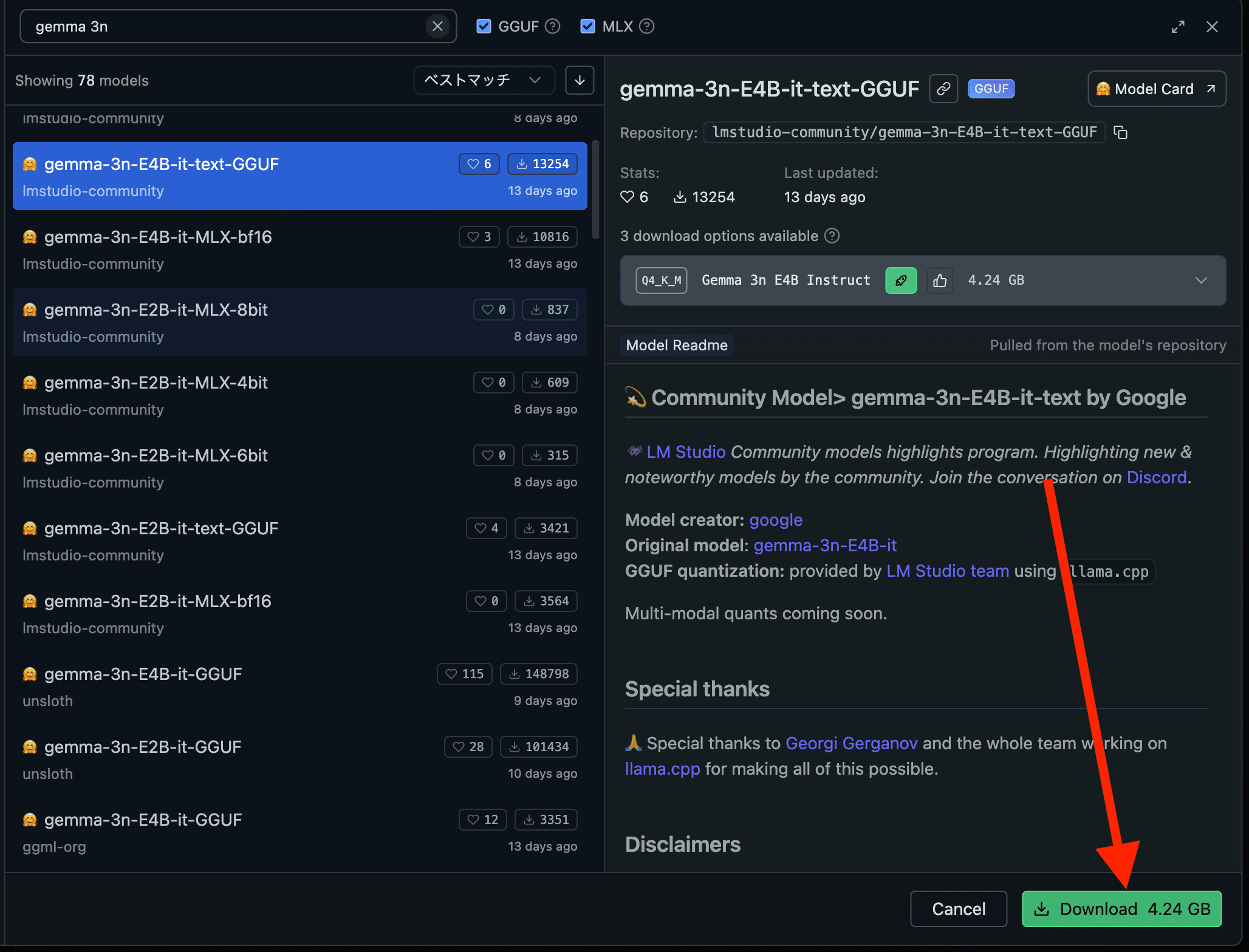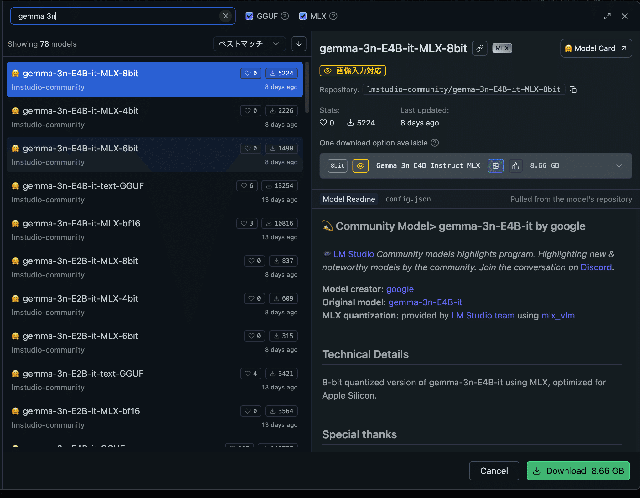 例として、Gemma 3nと検索してみます。Hugging Faceに公開されているモデルが一覧表示されます。