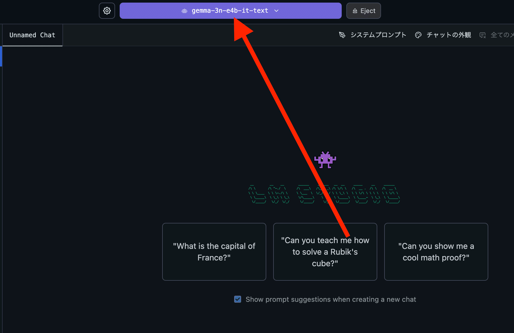 ダウンロードしたモデルと会話する画面です。モデルを読み込んだ後、この画面の下にある入力欄から質問や指示を送ります。開発者 (ターミナルアイコン >_)
