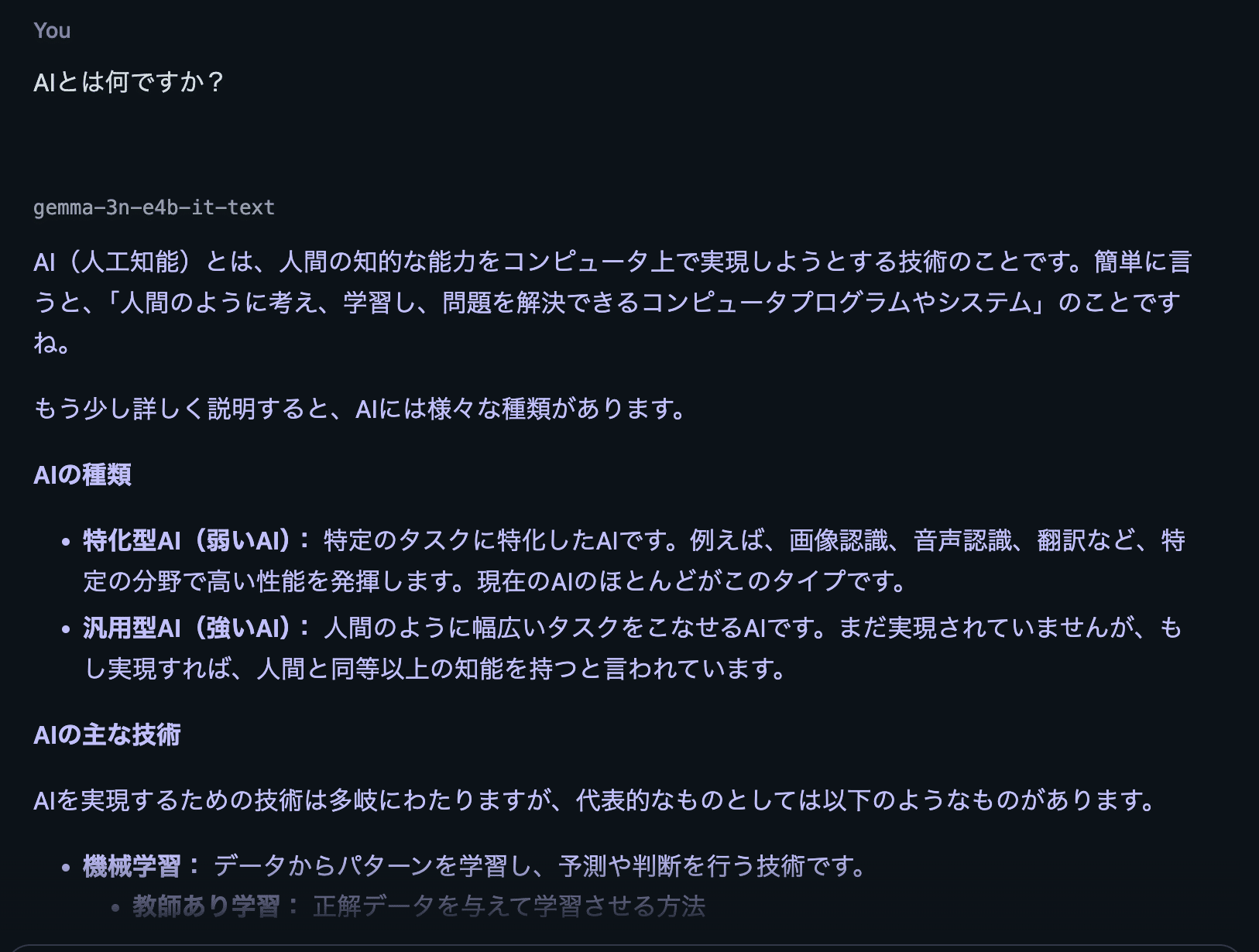 例えば「AIとは何ですか?」といった問いかけに対し、少し待つと回答が表示されます。ただし、応答が得られるまでの時間はモデルの規模やMacの性能によって変わります。