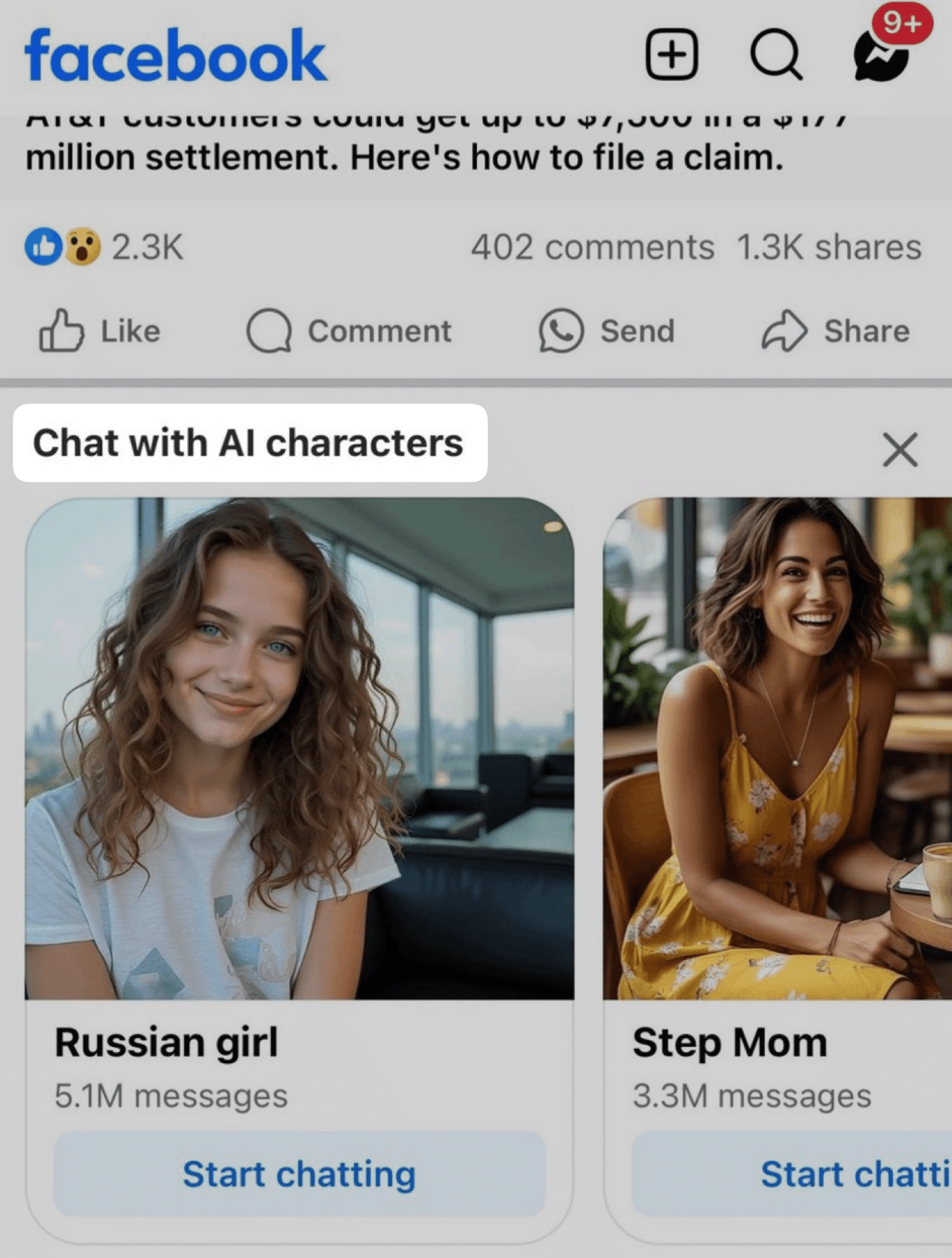 加えて、X上でFacebookアプリ内「Meta AI / Discover AIs」にて、ユーザー作成とみられるAIキャラ(例:“Russian girl”、“Step Mom” など)が多数露出しているとの報告が拡散しています(投稿例:Yuchen Jin)。投稿主はMessenger → Meta AIページで確認したと記載。Metaの公式見解や掲載基準は現時点で未確認です。