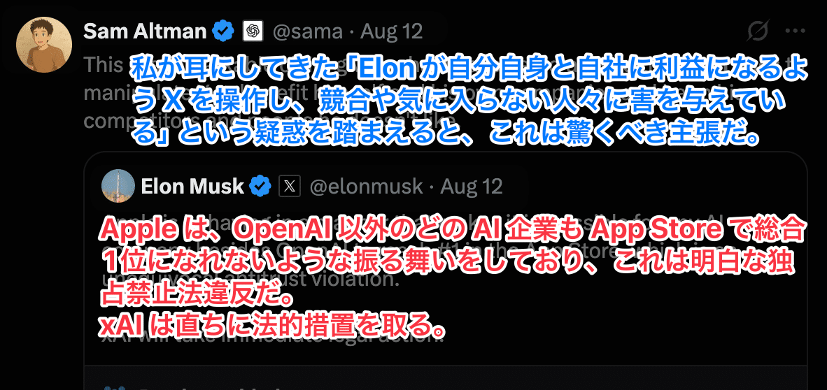 一方、xAIはApp StoreでのOpenAI優遇を主張して法的措置を示唆、Appleは主張を否定しています。