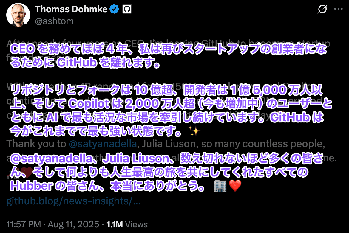 Microsoft傘下のGitHubでCEOを務めるThomas Dohmke氏が退任。GitHubはMicrosoftのCoreAIチームへ統合され、2018年の買収以来維持されてきた独立運営が終了します。併せて、Microsoftは開発者向けにGPT-5の統合を進めています。