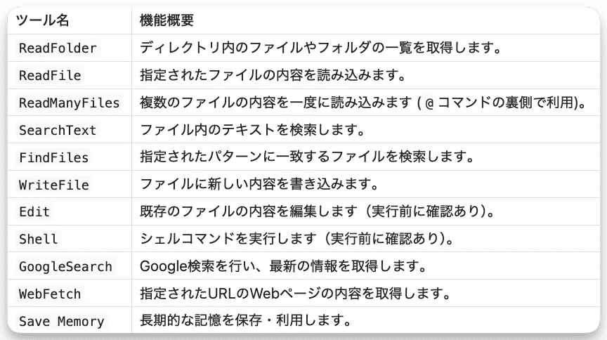 Gemini CLIの最大の特徴は、AIが状況を判断し、様々な「ツール」を自動で使い分けてくれる点にあります。
