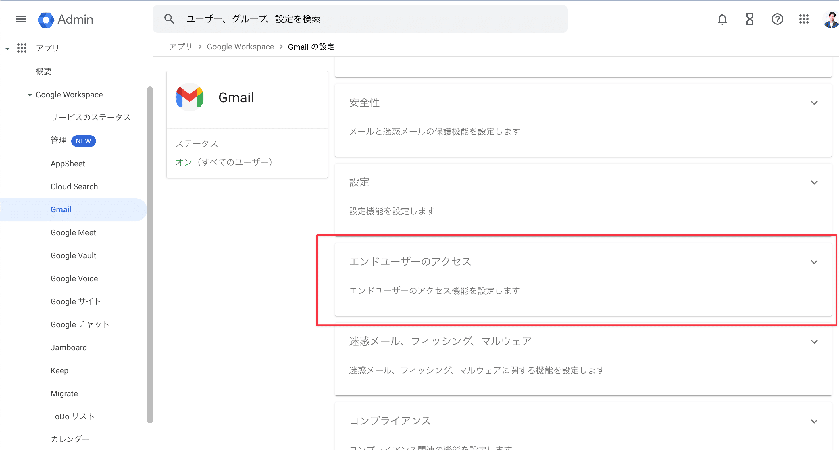 左側のメニューから「アプリ」→「Google Workspace」→「Gmail」と進みます。