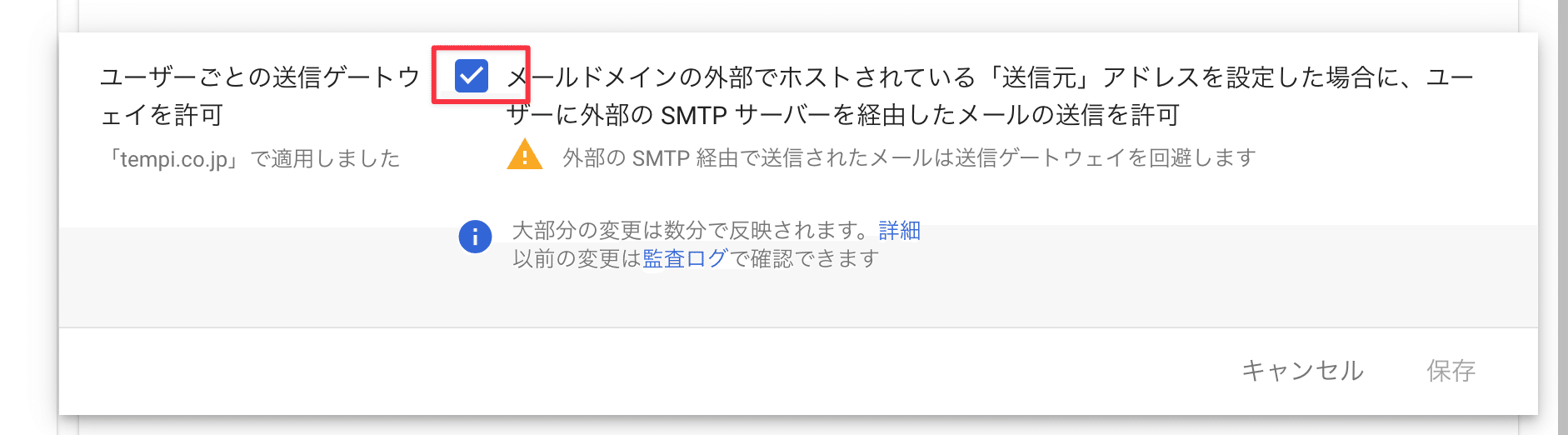 「メールドメインの外部でホストされている「送信元」アドレスを設定した場合に、ユーザーに外部のSMTPサーバーを経由したメールの送信を許可」にチェックを入れて、設定を保存します。