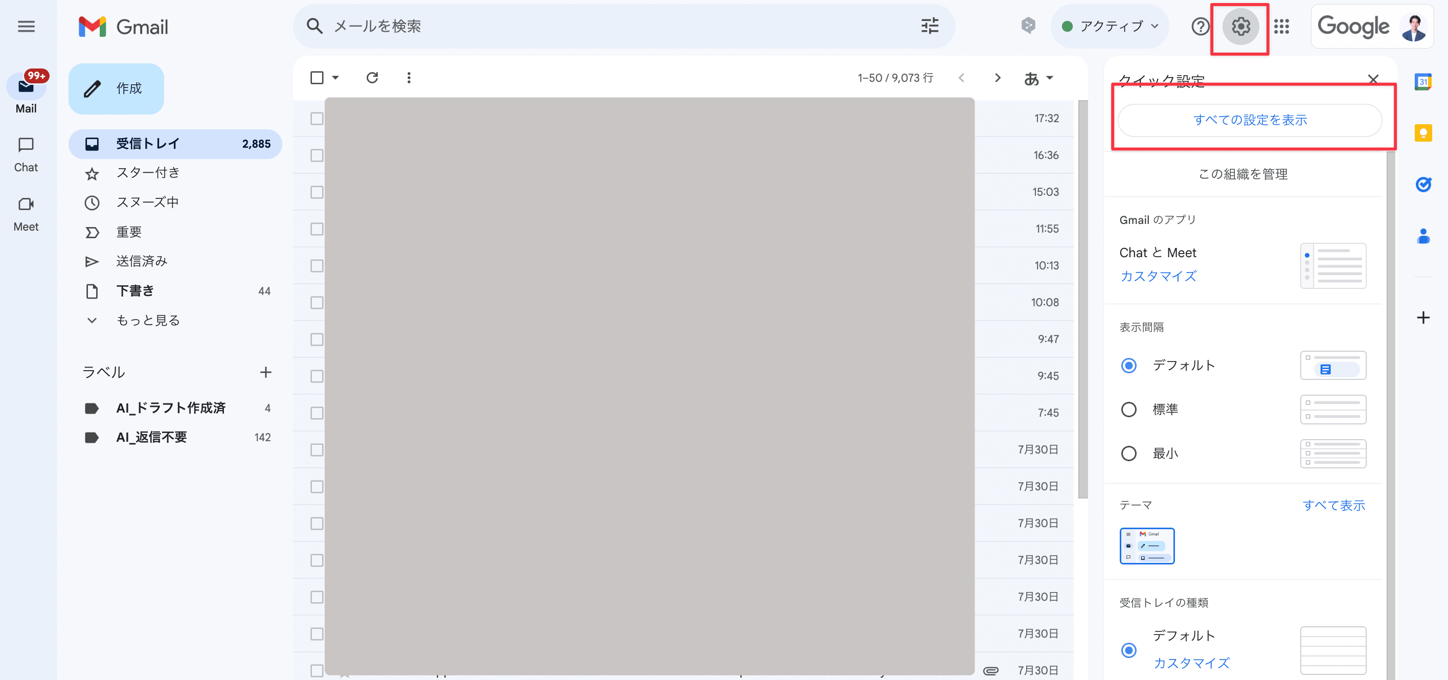 Gmailを開き、右上の歯車アイコンをクリックして「すべての設定を表示」を選択します。