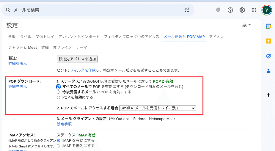 「メール転送とPOP/IMAP」タブを開き、POPダウンロードの項目で、「すべてのメールでPOPを有効にする」を選択します。