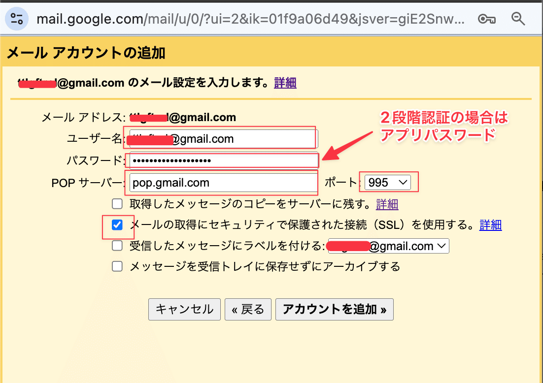 POPサーバー: pop.gmail.com