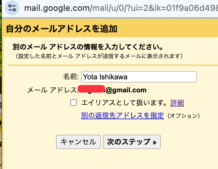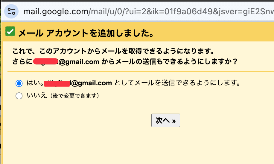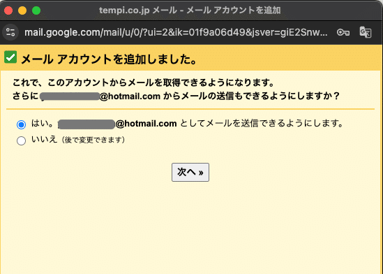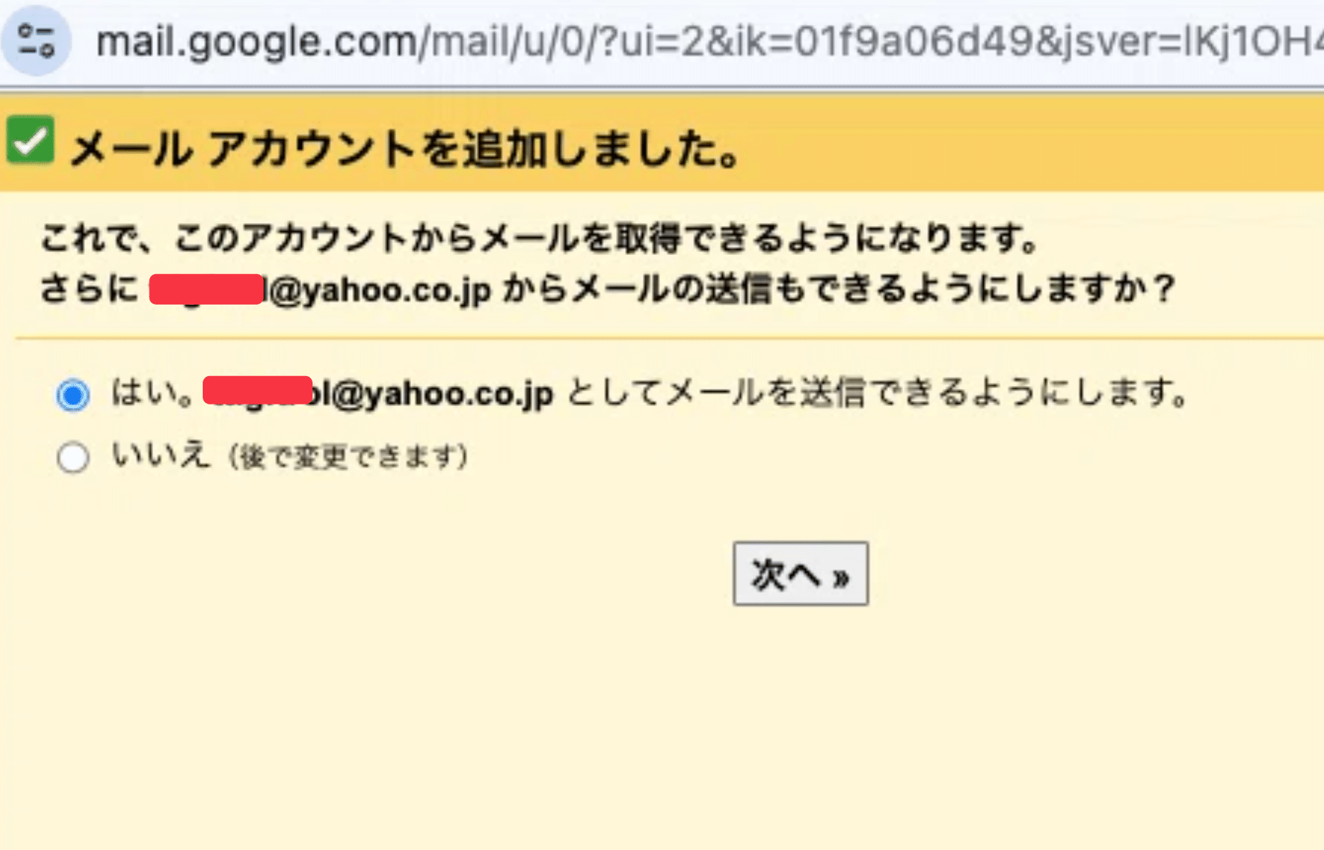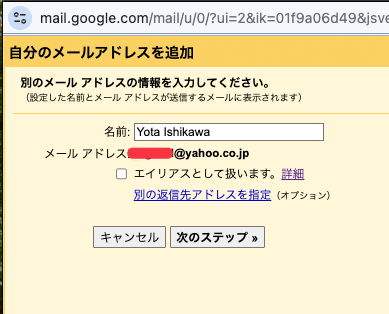 続いて、「次へ」を押して、Yahooアドレスとして送信できるようにします。