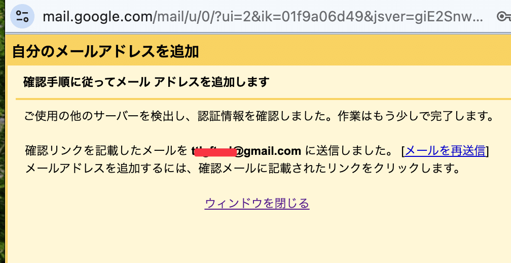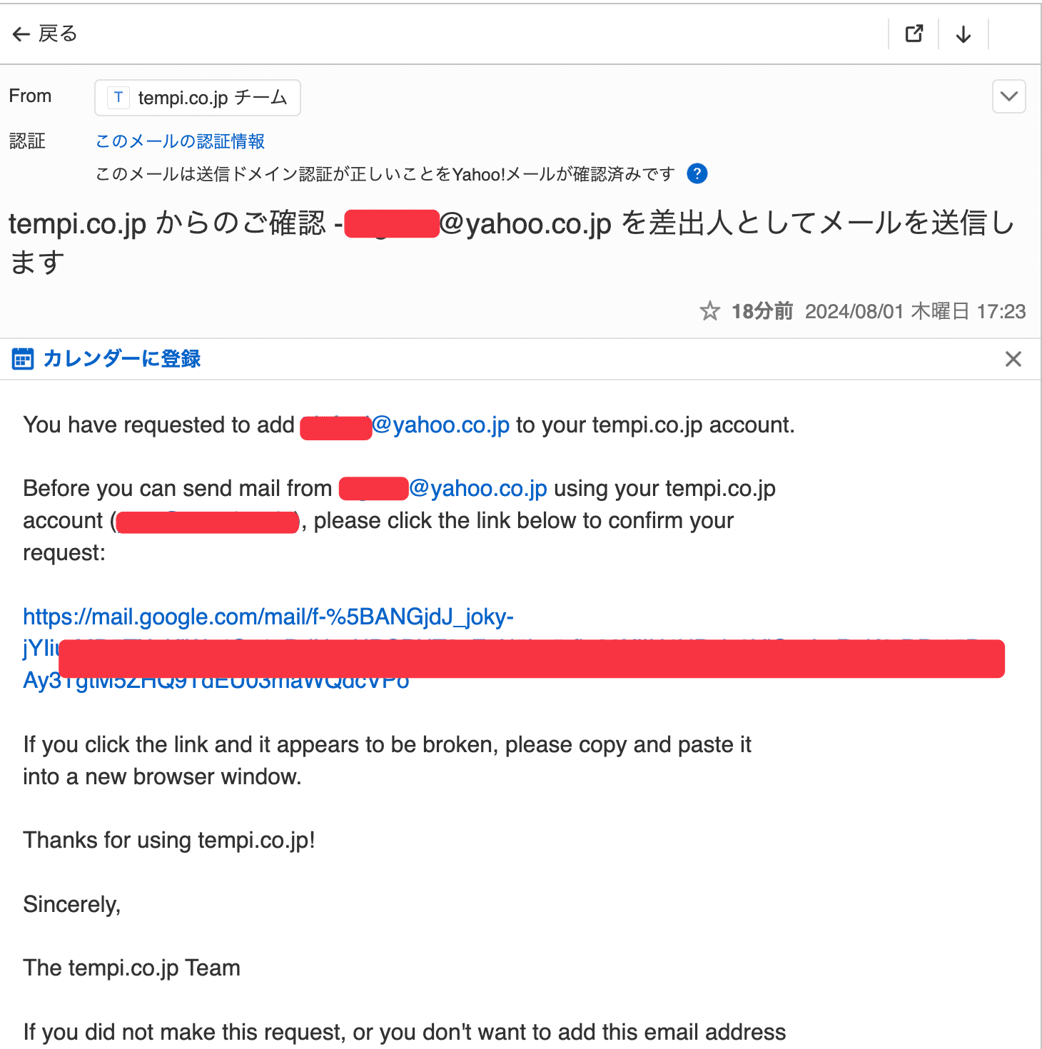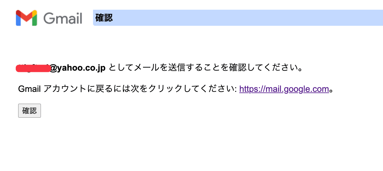 これにより、yahooの方に以下のような認証のメールが来るため、リンクをクリックします。