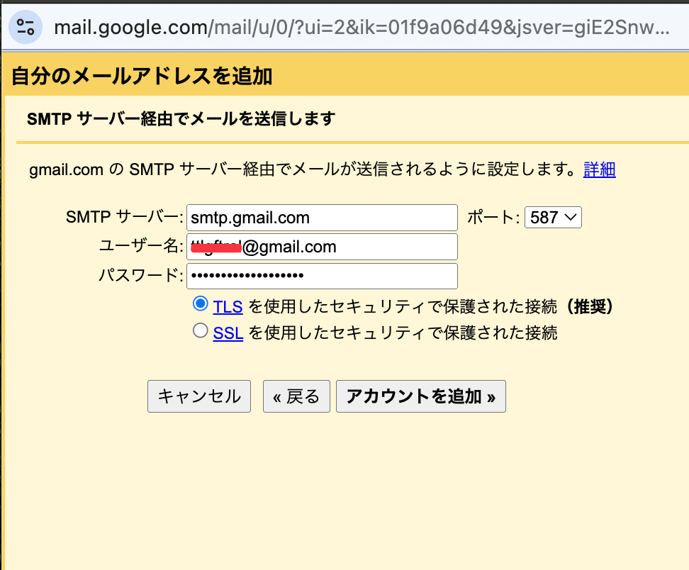 SMTPサーバー:smtp.gmail.com