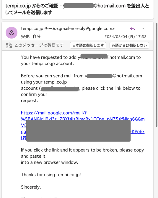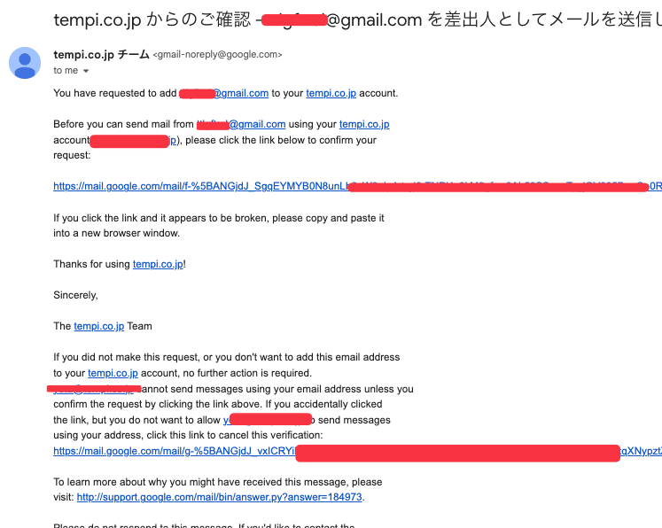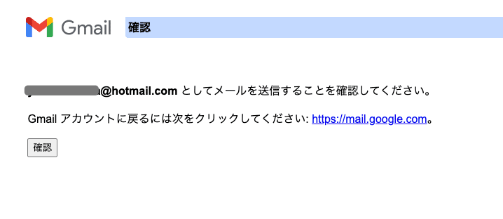 取り込み元のメールボックスを確認すると、以下のような確認のメールが来ています。