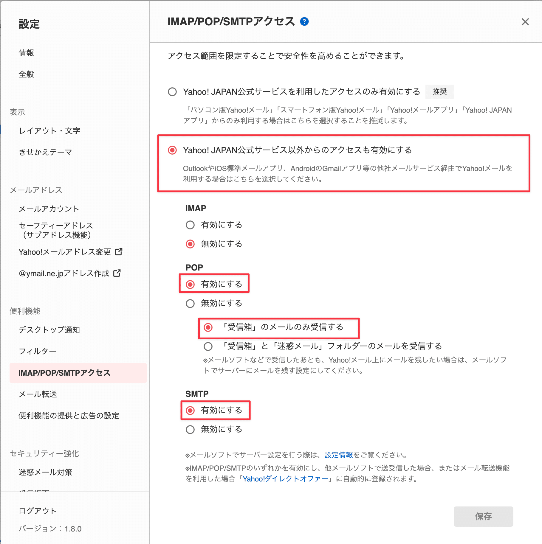 以下の設定を行い、POPおよび、SMTPを有効にします: