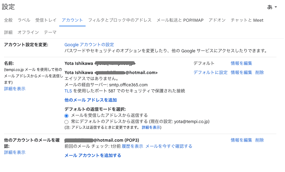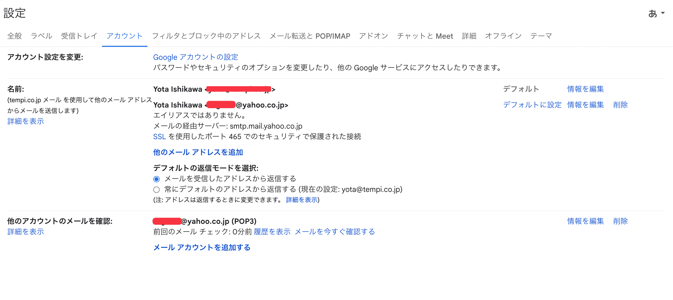 Gmail設定画面のアカウントタブに行くと、yahooアカウントが追加されていることがわかります。