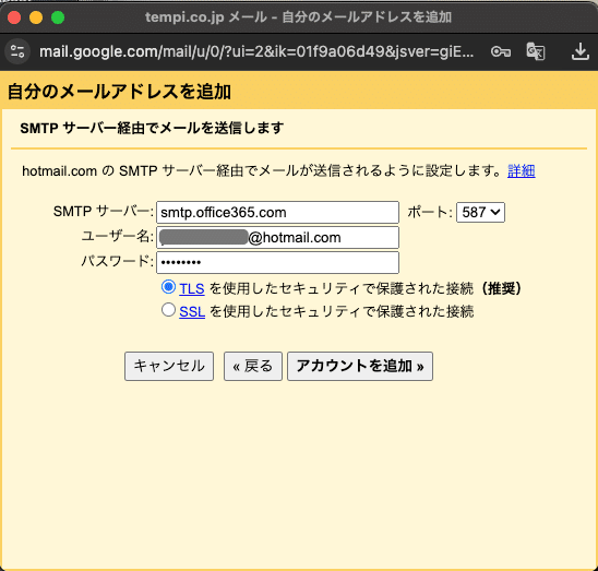 SMTPサーバー:smtp.office365.com