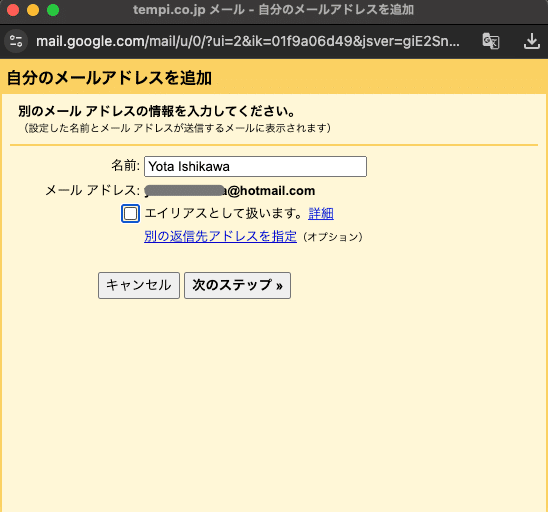 「エイリアスとして扱います。」のチェックを外して「次のステップ」をクリックします。
