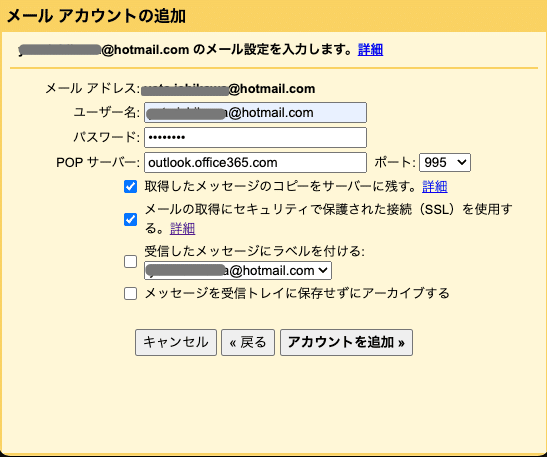 POPサーバー:outlook.office365.com