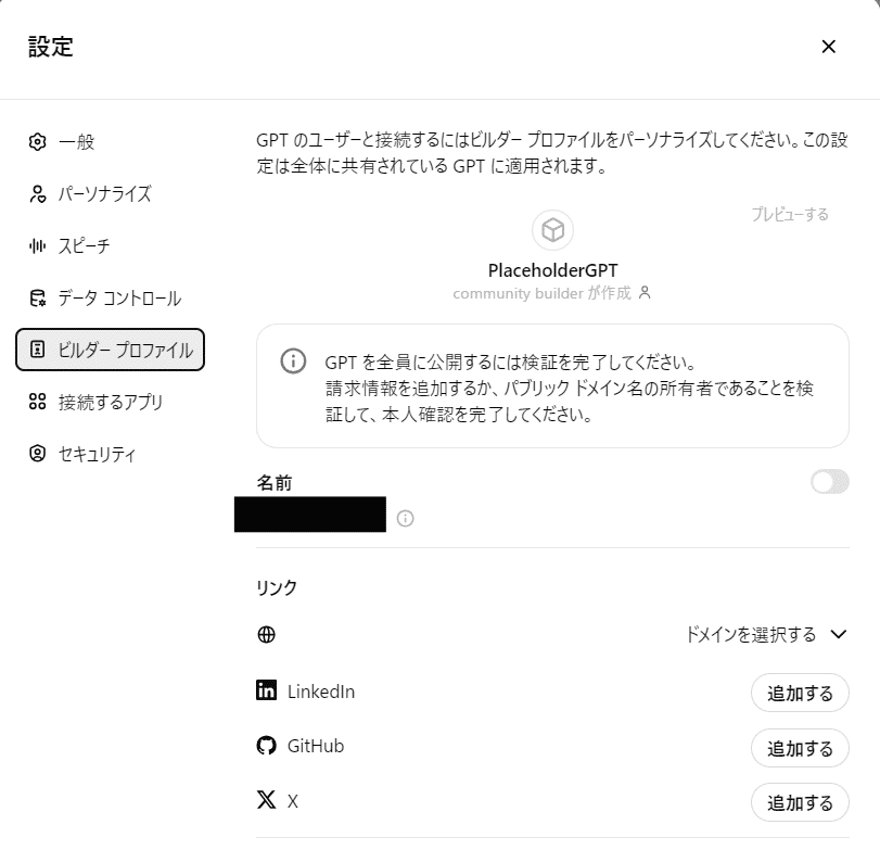 ChatGPTの設定>ビルダープロフィールで、GPTの説明と同時に表示できます。