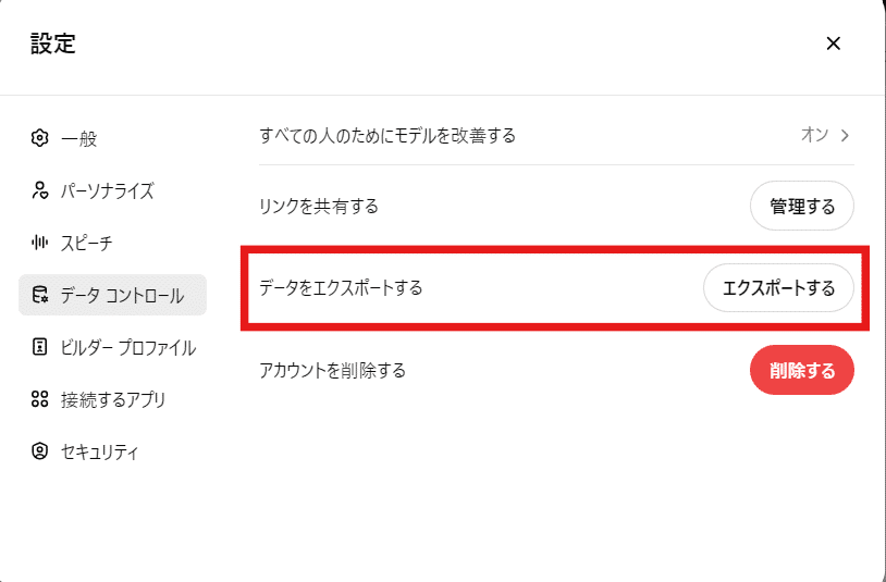 設定>データコントロールで、データをエクスポートすると今までのチャット履歴を全てエクスポートが可能です。