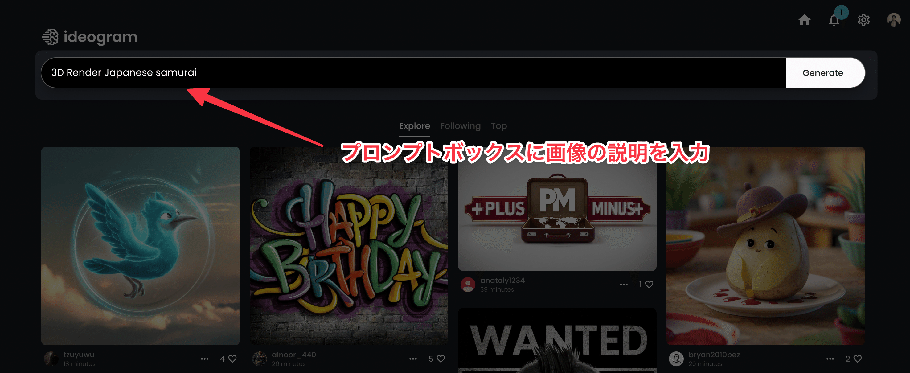 ※ 現在、Ideogramは日本語の入力には対応していないため英語で入力する必要があります。
