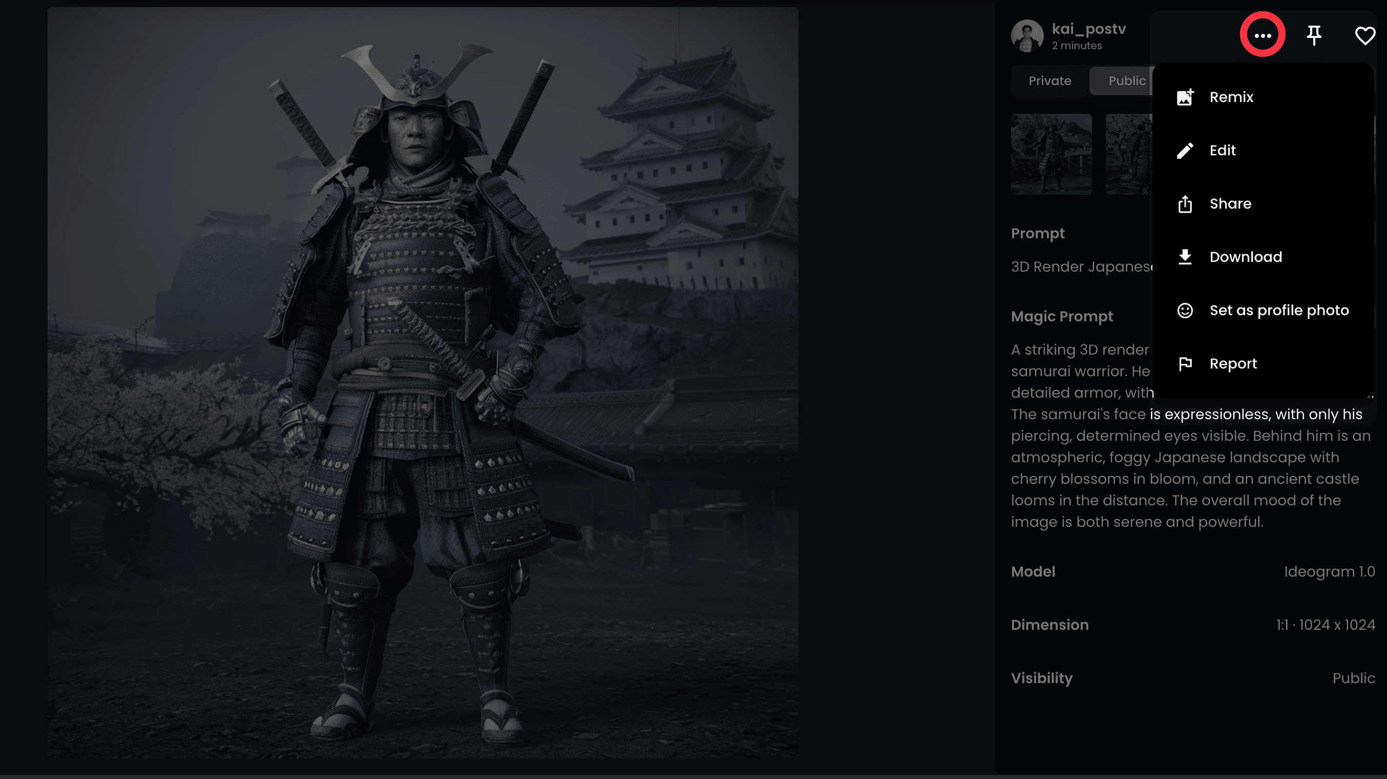 気に入った画像をクリックして、右上の「・・・」マークから、ダウンロードやいいね、リミックスなどの操作ができます。