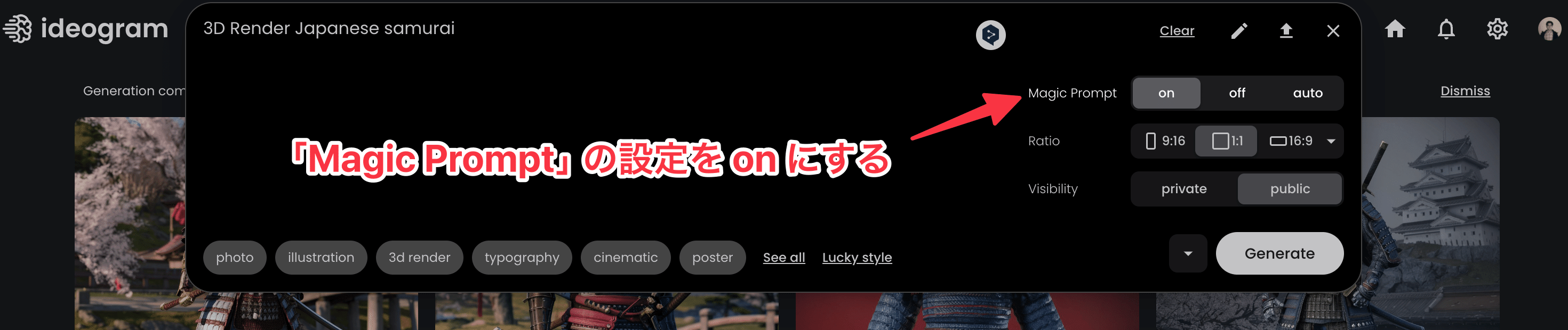 Magic Promptは、ユーザーが入力したプロンプトをAIが解釈し、最適化することで、バリエーション豊かな画像を生成してくれる機能です。Magic Promptを使用するには、プロンプト入力欄の右側にあるトグルスイッチをONにします。