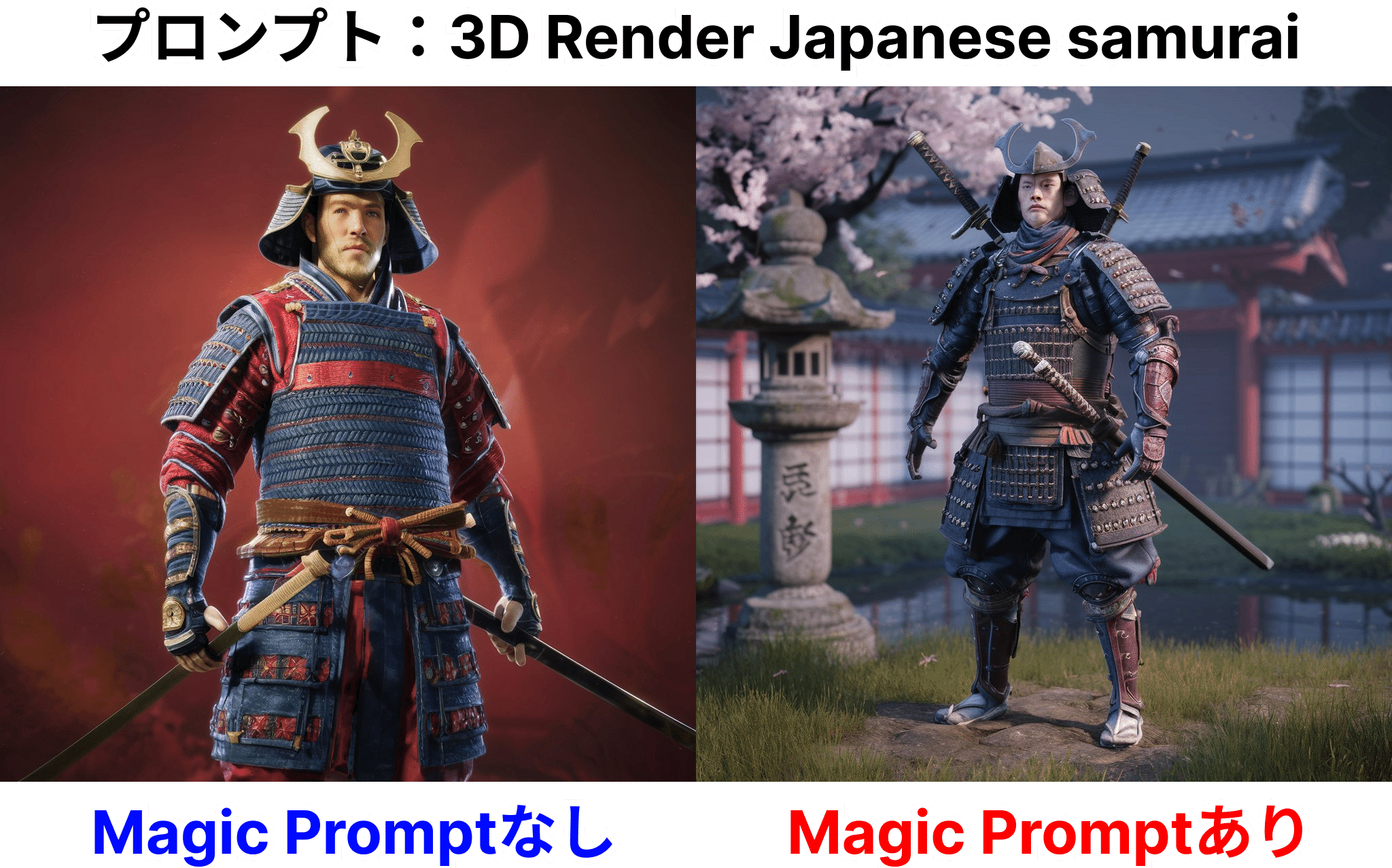 左の画像は、"3D Render Japanese samurai"というシンプルなプロンプトをMagic Promptを使用せずに生成したものです。一方、右の画像は、同じプロンプトをMagic Promptを使用して生成したものです。