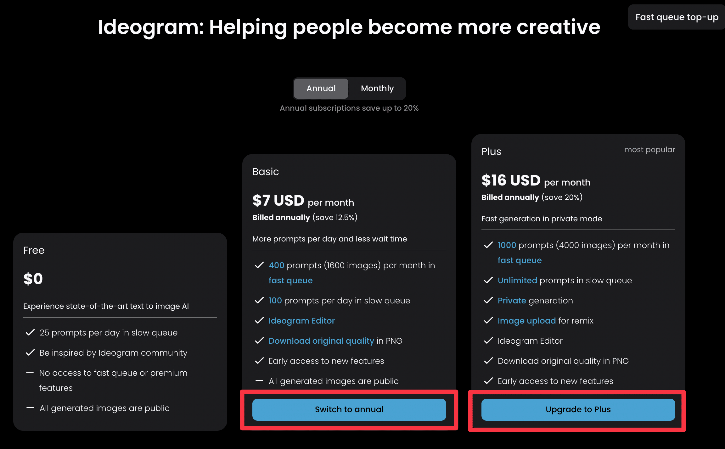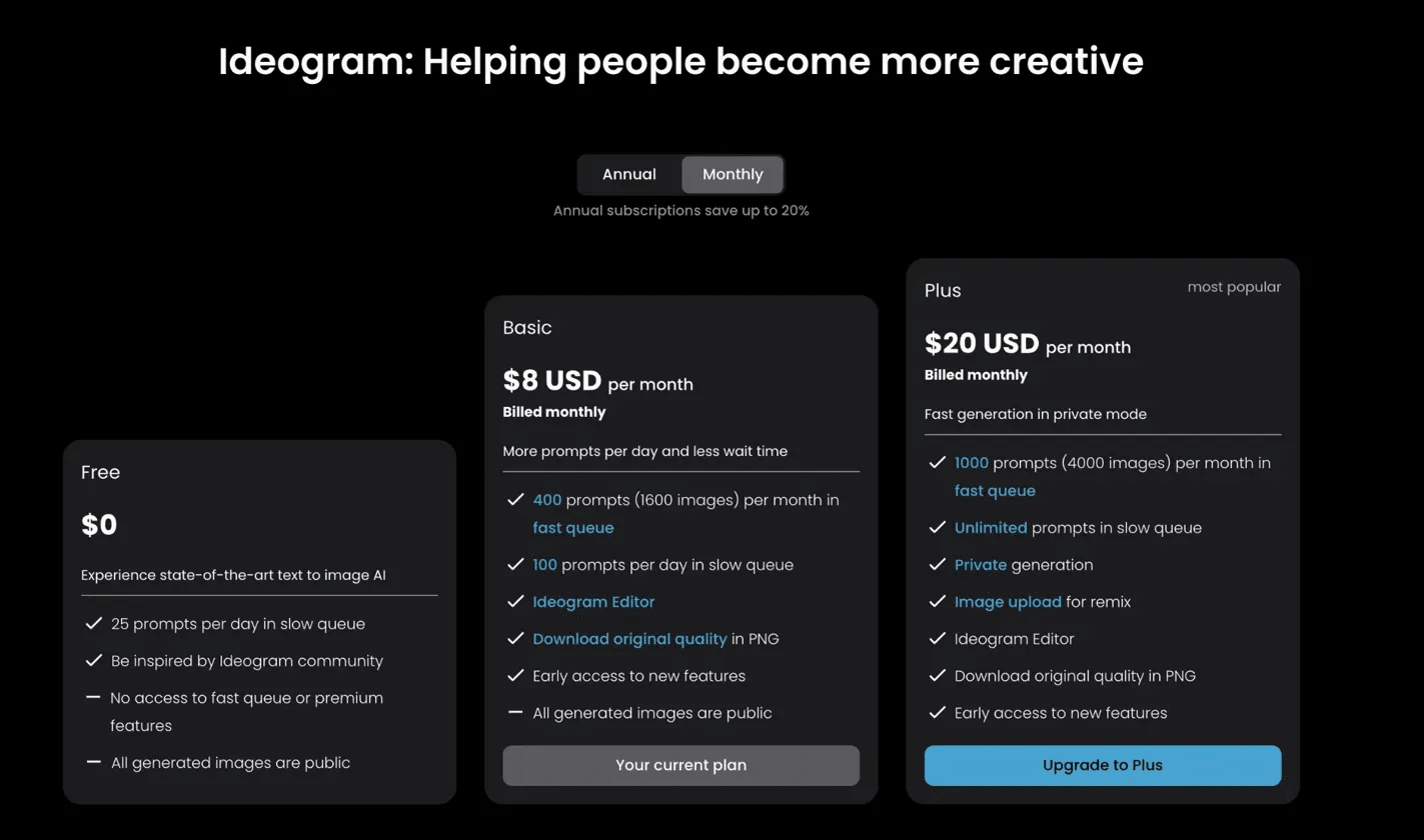 Ideogramには、無料プラン、ベーシックプラン、プラスプランの3つの料金プランがあります。以下は、各プランの主な特徴です。