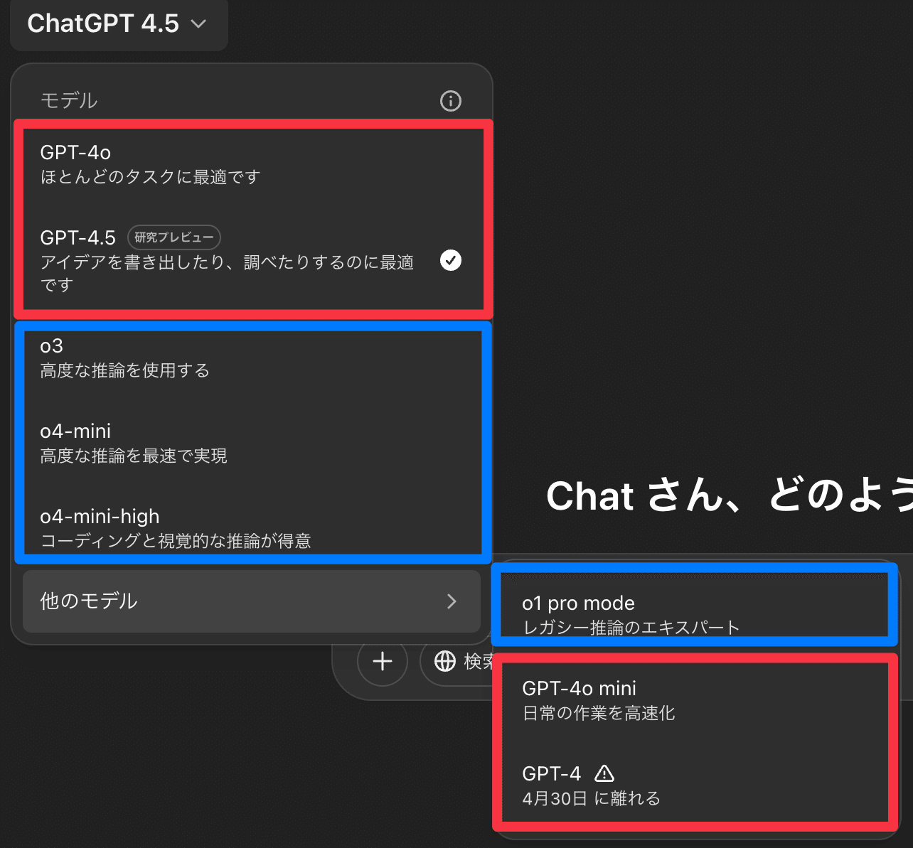 より人間らしい対話やクリエイティブな出力が欲しい場合は GPT-4o や GPT-4.5 へ、超難問に取り組む際は o1 pro mode へ、といった柔軟な切り替えが可能です。