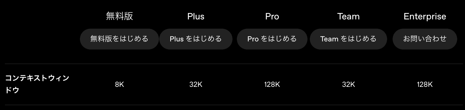 コンテキストウィンドウ(AIが一度に覚えておける“会話のメモリ容量”みたいなもの) はプランによって変動します。特にPro/Enterpriseプランでは128kトークン()となっています。