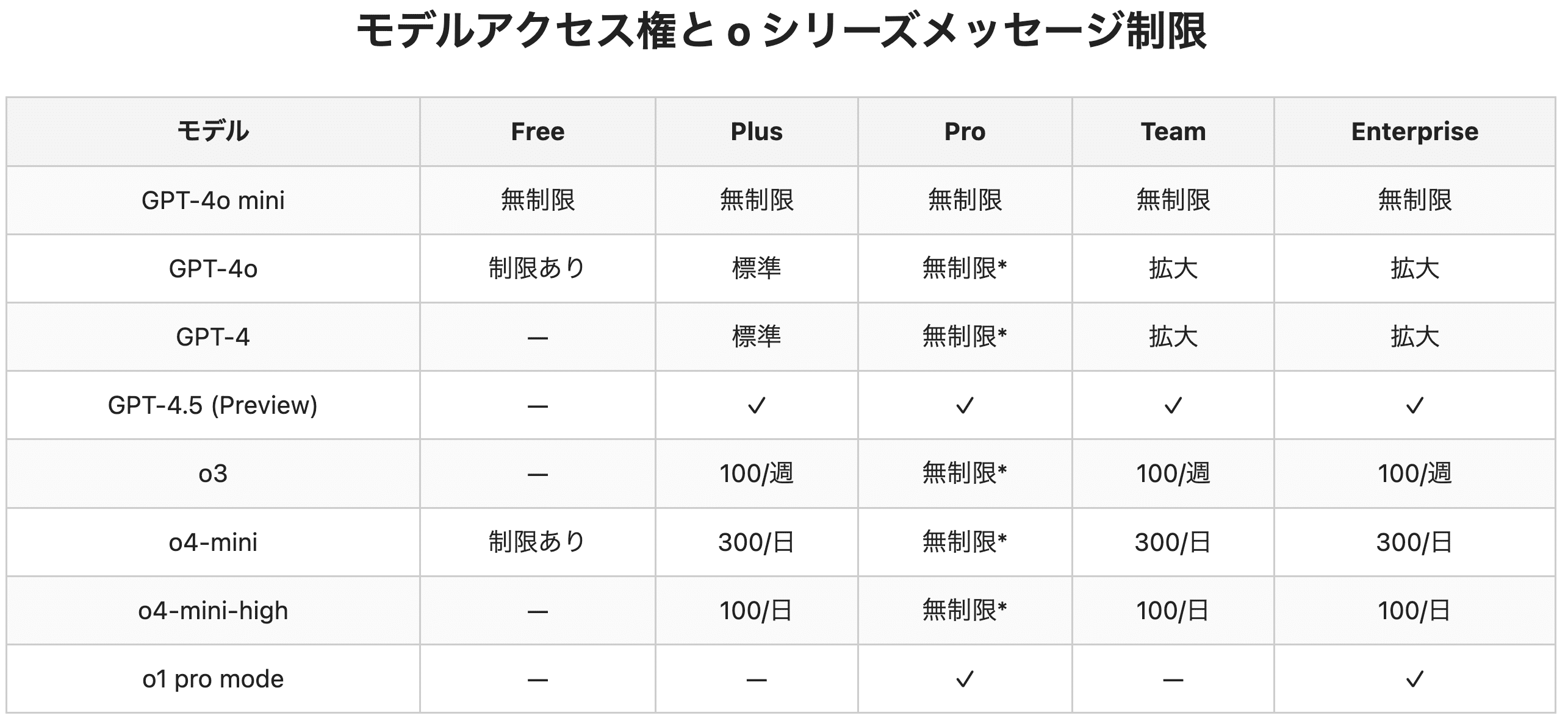 また、アクセスできるモデルも使っているプランによって変わってきます。モデルへのアクセス権と、メッセージ制限をプラン別にまとめました。