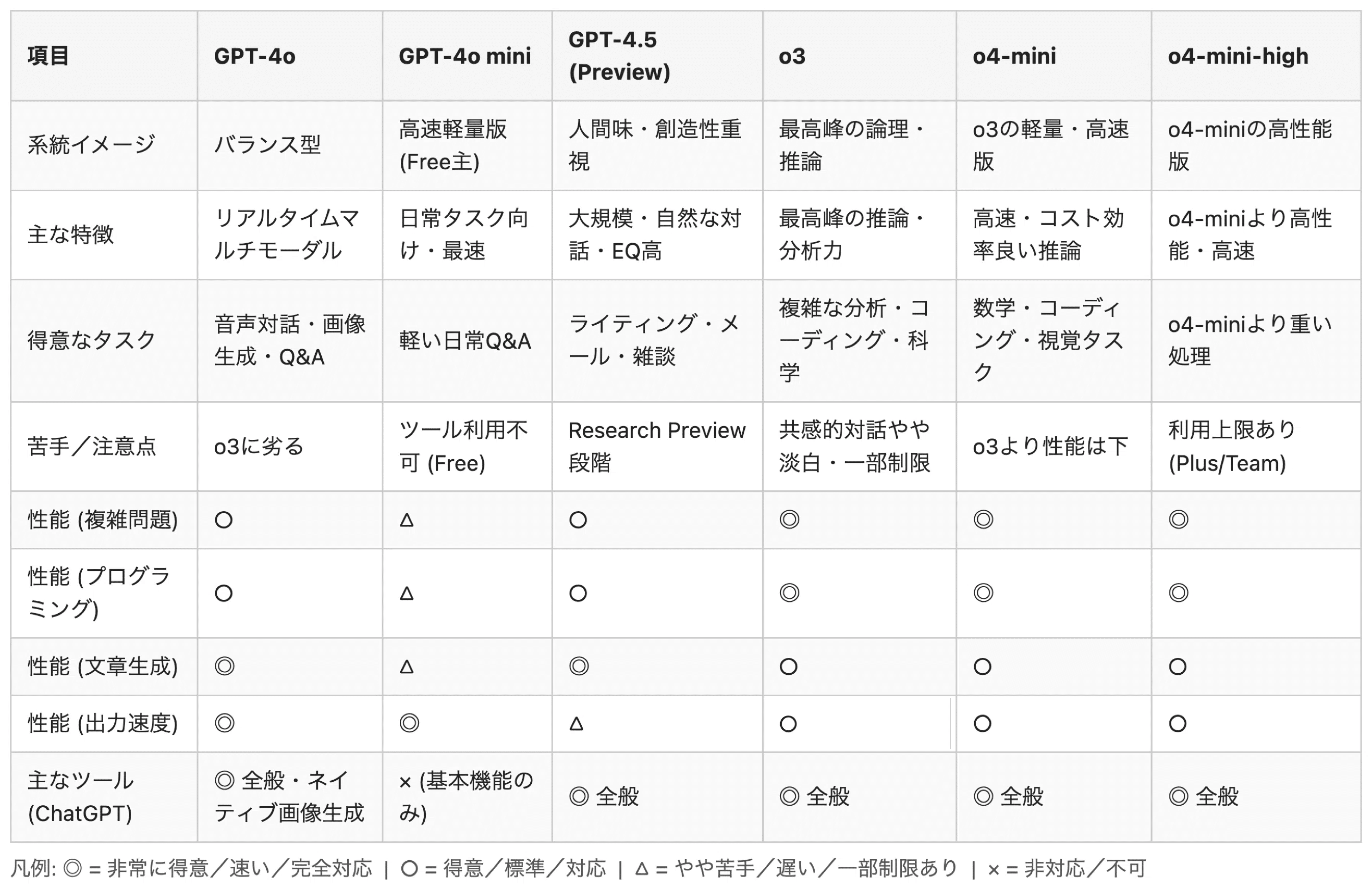 各モデルの得意分野や注意点を公式ドキュメントをもとに 非常に得意/得意/苦手/非対応 で評価しています。