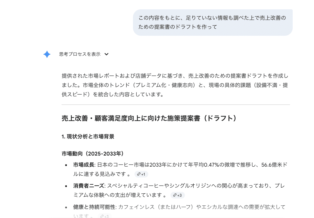 たとえば要約のあとに「この内容をもとに、足りていない情報も調べた上で売上改善のための提案書のドラフトを作って」と続けると、ソースに基づいた提案書の骨子が生成されました。