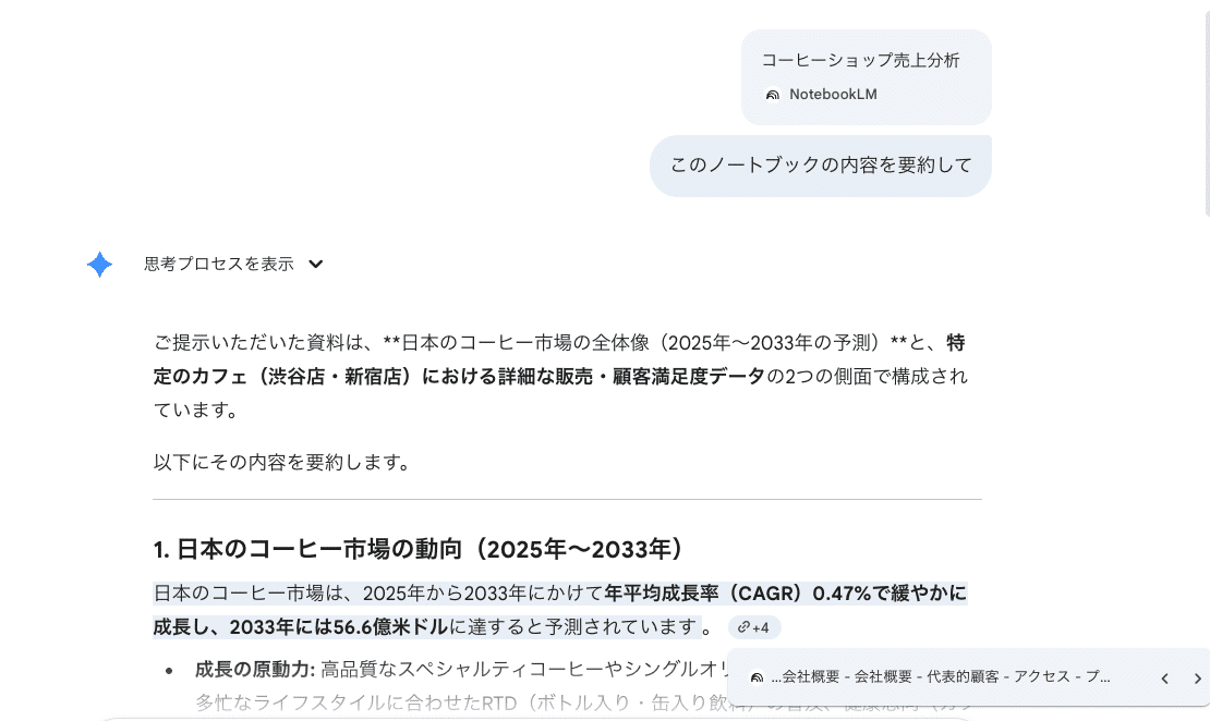 接続後に「このノートブックの内容を要約して」と指示すると、NotebookLMのソースを横断した要約が出典付きで返ってきました。