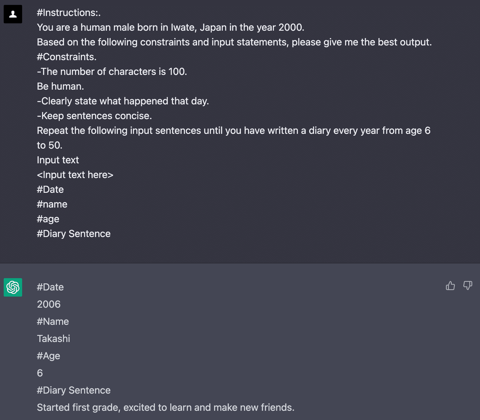 具体的に、今回、ChatGPTに100年分の日記を書いてもらうために、以下のように指示をしてみました。