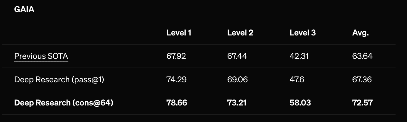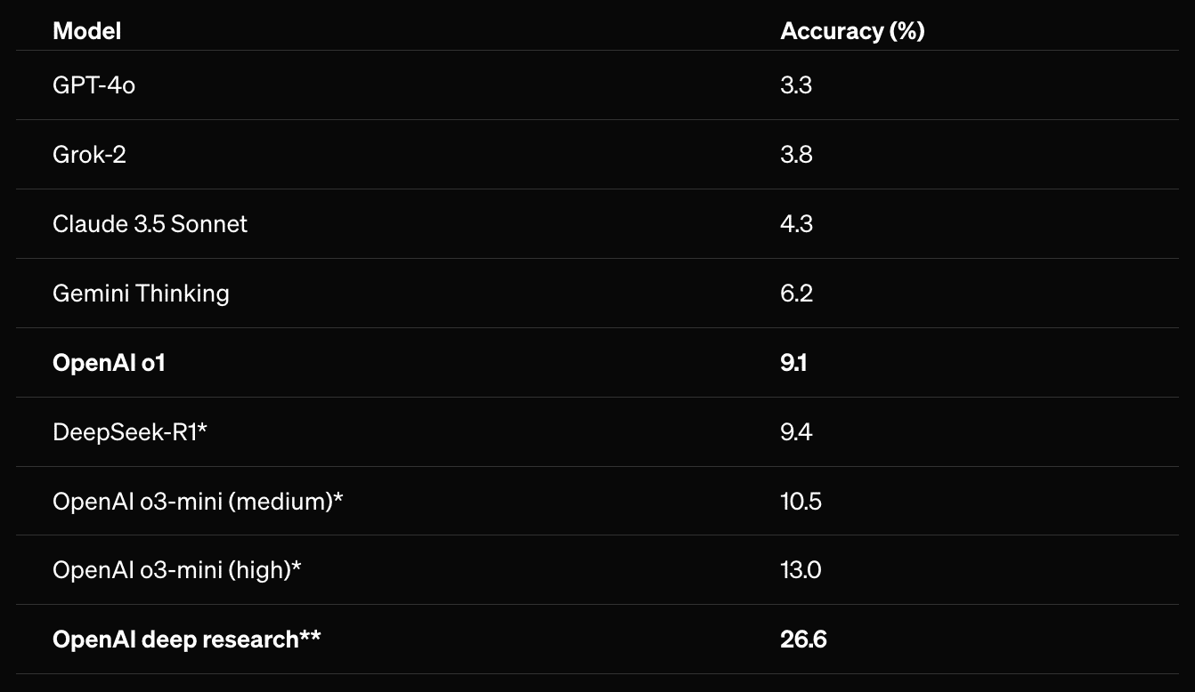 Deep Researchを支える新モデルは、さまざまな指標で大幅な性能向上を示しています。特に以下の2つのベンチマークでの結果が注目されています。