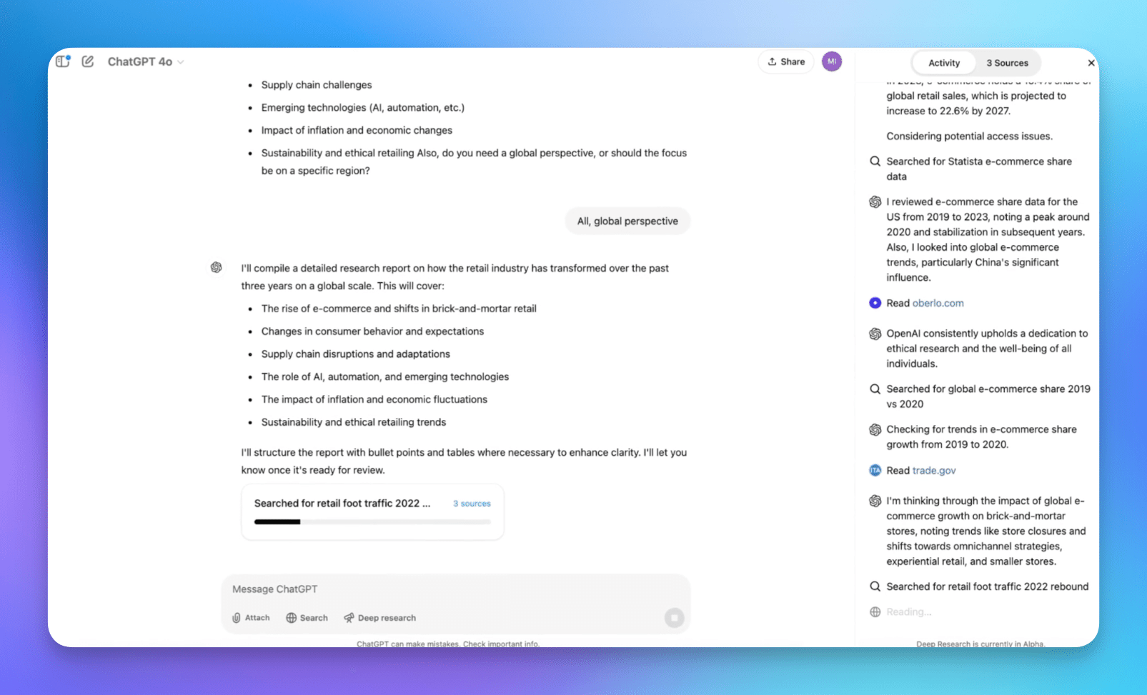 これまでモデルは比較的短い対話サイクルで回答するのが一般的でしたが、Deep Researchでは5分から最大30分以上にわたって自主的に調査を行い、より複雑なタスクを完結。