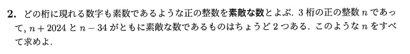 どの桁に現れる数字も素数であるような正の整数を素敵な数とよぶ、3桁の正の整数nであって、n+2024とn-34がともに素敵な数であるものはちょうど2つある、このようなnをすべて求めよ。