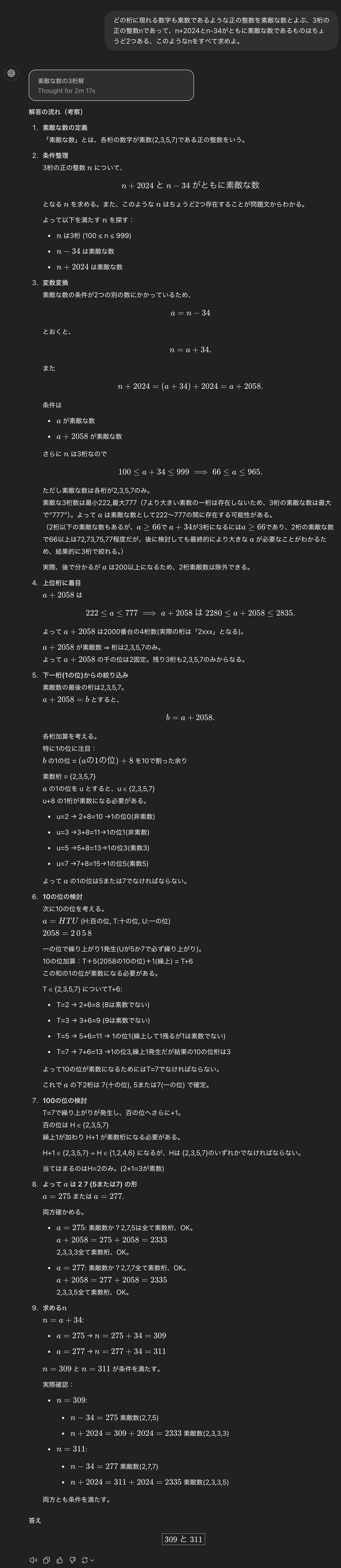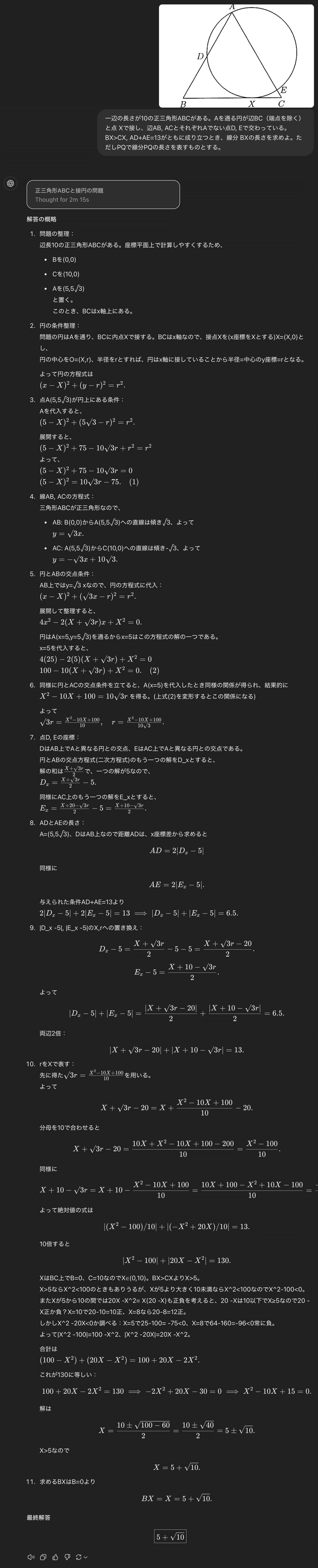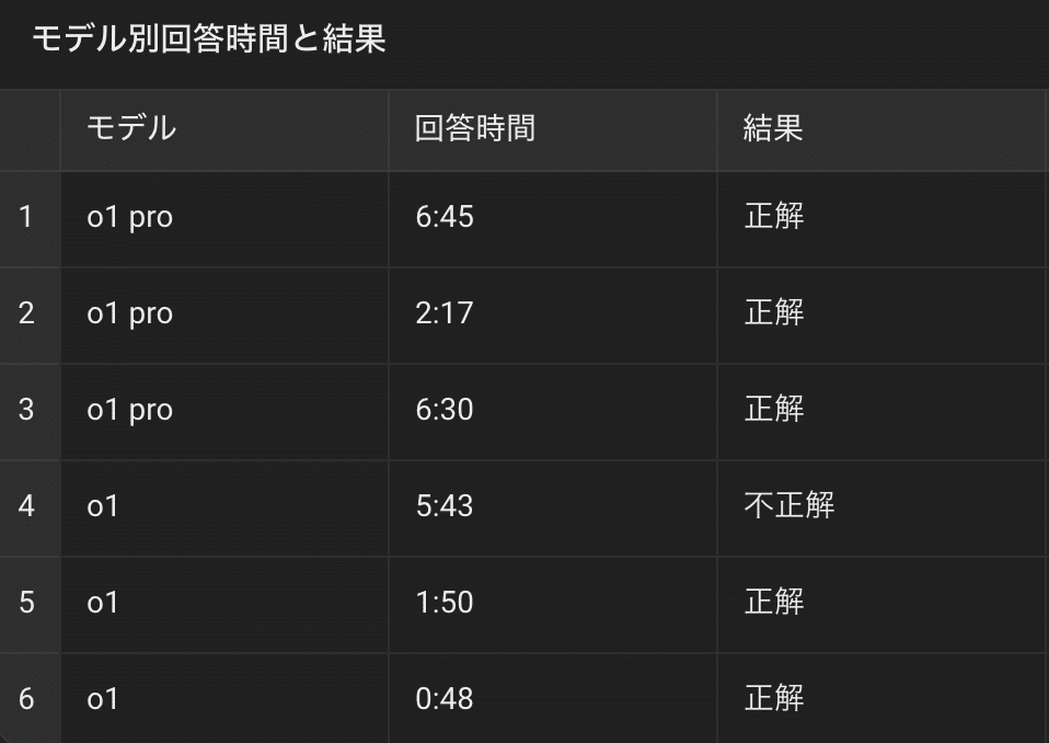 ここまでの検証から、o1 Proは丁寧に問題を解き解説も細かく行う傾向がありそうです。回答時間も、o1の2倍以上かかっています。