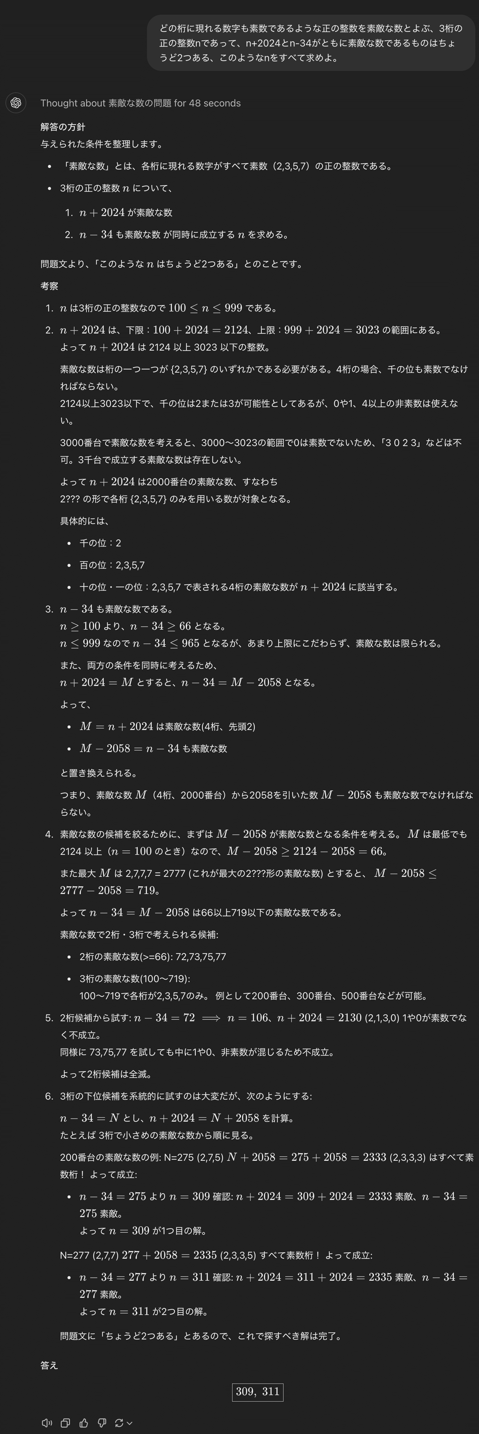 まず、o1モデルが得意とする数学問題を解かせてみます。