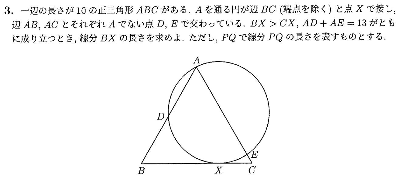 一辺の長さが10の正三角形ABCがある。Aを通る円が辺BC(端点を除く)と点 Xで接し、辺AB, ACとそれぞれAでない点D, Eで交わっている。BX>CX, AD+AE=13がともに成り立つとき、線分 BXの長さを求めよ。ただしPQで線分PQの長さを表すものとする。