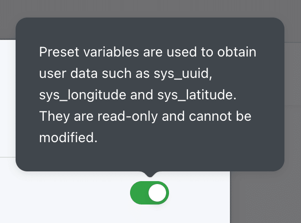 Preset variables(プリセット変数): プリセット変数は、ユーザーデータ(例:sys_uuid、sys_longitude、sys_latitude)を取得するために使用されます。これらは読み取り専用で、変更することはできません。