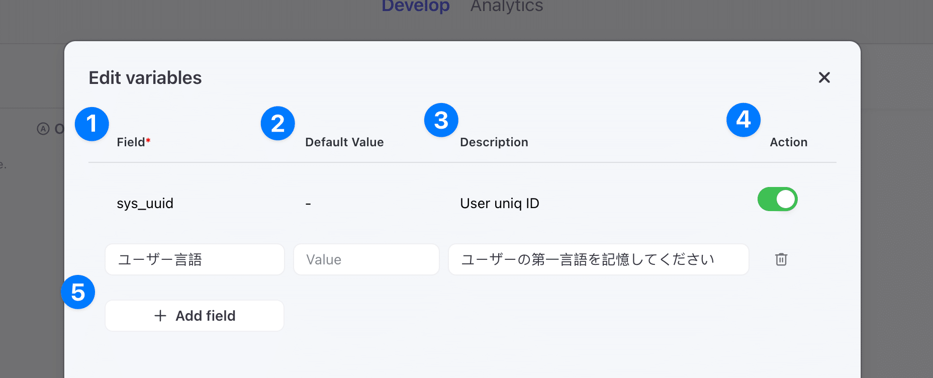 ③ 「+」アイコンをクリックし、変数名、デフォルト値、説明を入力します。