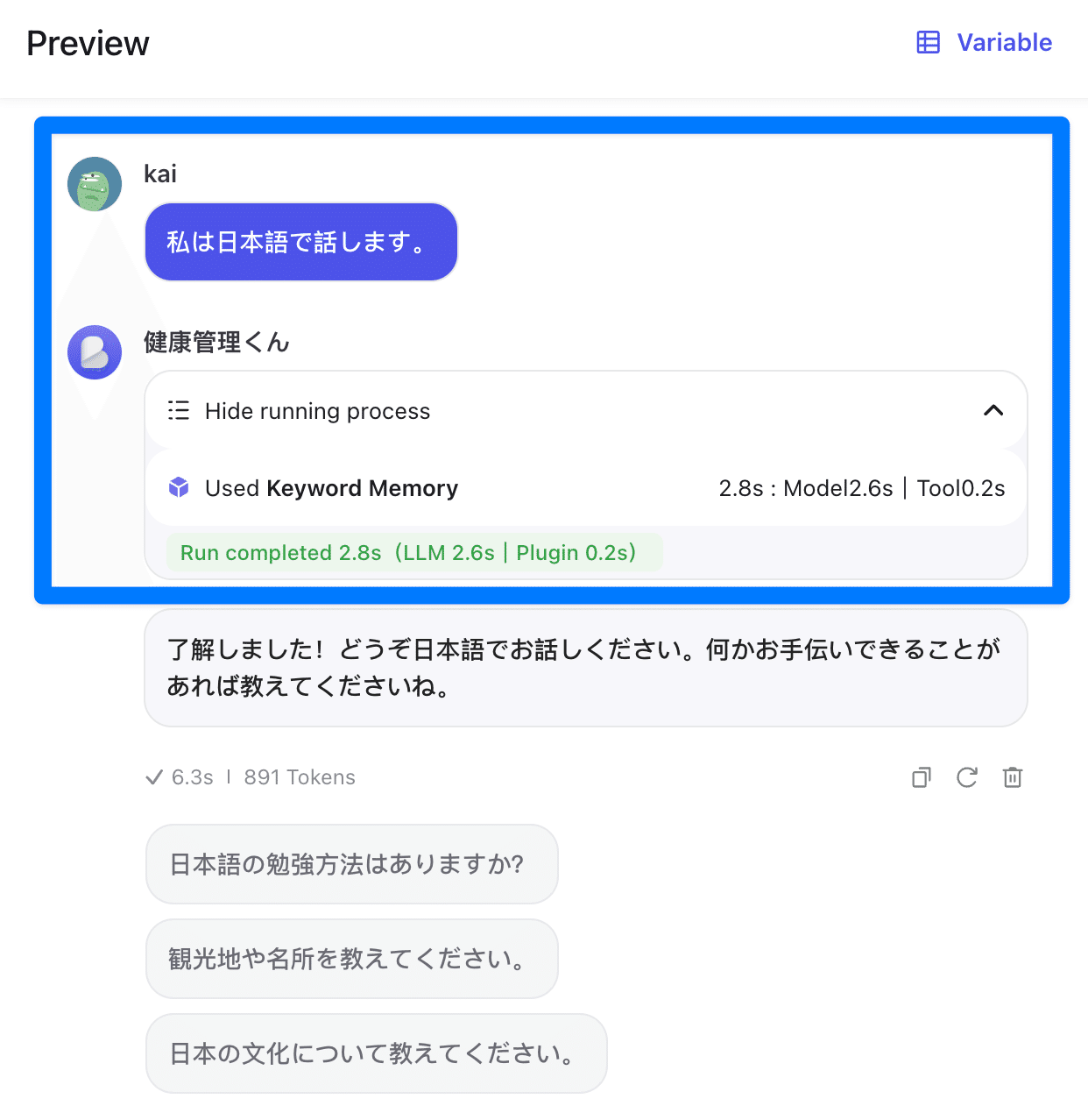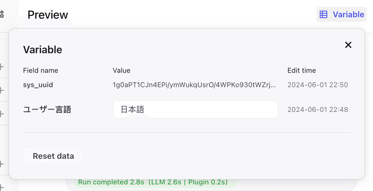 「Preview」パネル右上の「Variable」リンクをクリックすると、ボットで使用されている変数を確認できます。ユーザーが新しい値を入力すると、変数の値は自動的に更新されます。