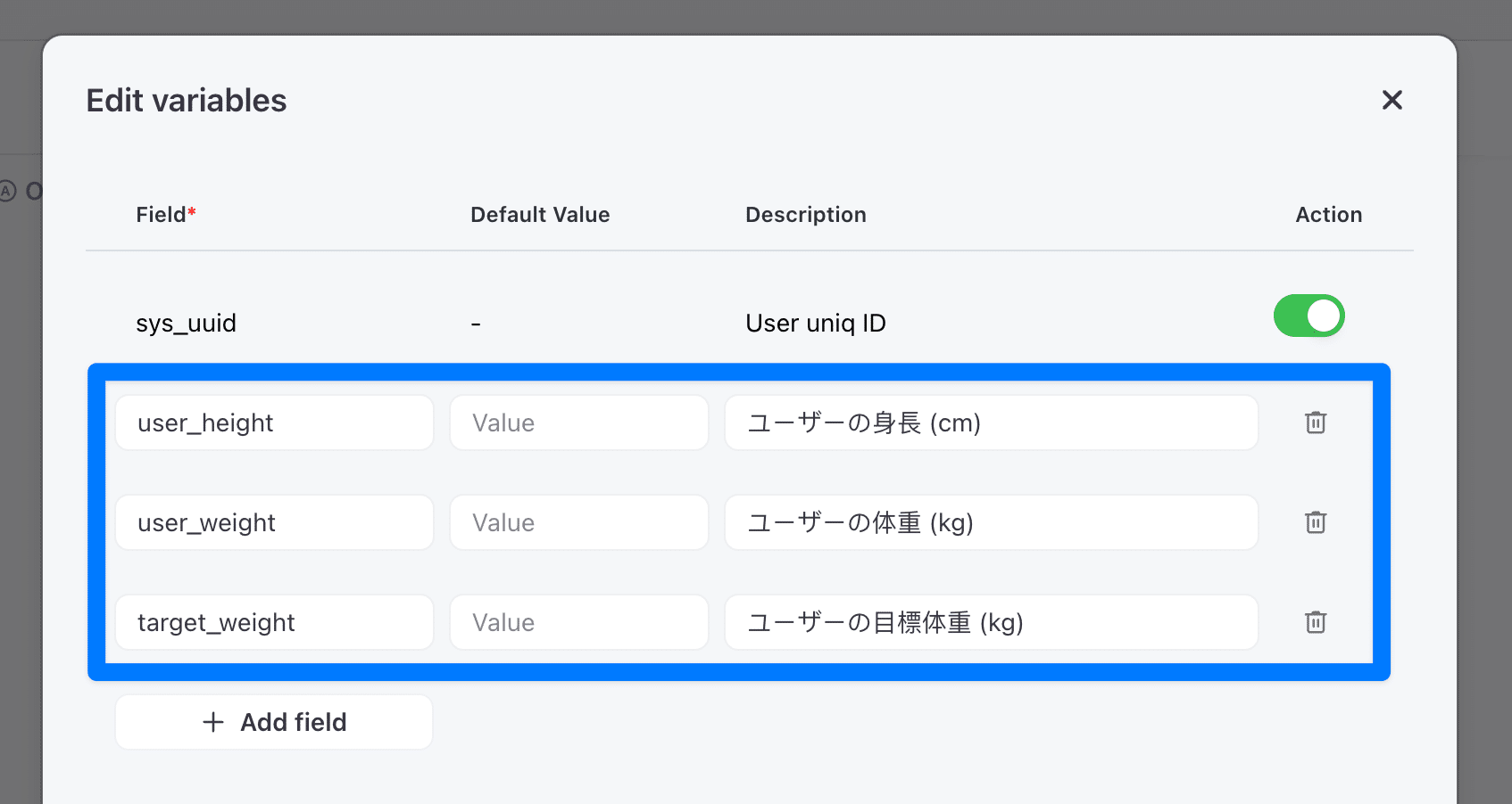 変数名: `user_weight`、デフォルト値: 空欄、説明: ユーザーの体重 (kg)