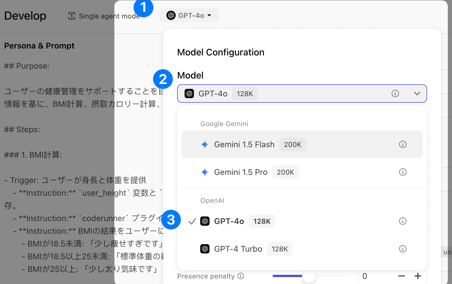 次に、ボットが使用するAIモデルを選択します。Cozeでは、最新の「GPT-4o」や「Gemini 1.5 Pro」が無料で利用できます。