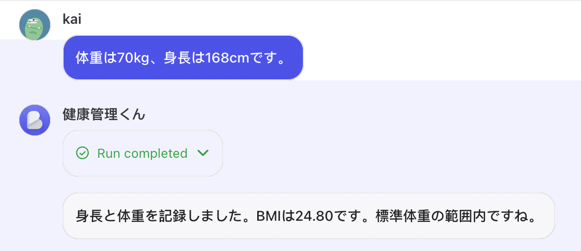 - 出力形式: 「身長と体重を記録しました。BMIはXX.XXです。標準体重の範囲内ですね。」