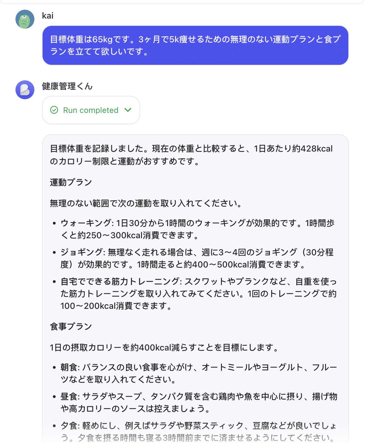 - 運動量提案エラー: 目標体重が提供されなかった場合、「目標体重を提供してください」と返答。